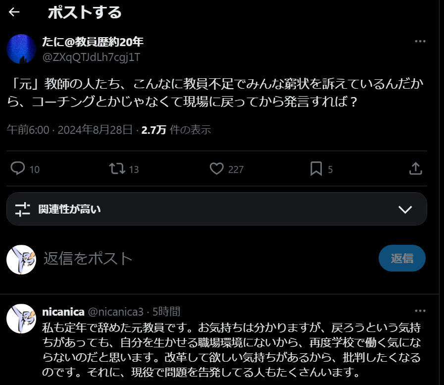 昨日Xのタイムラインを見ていたら、上のような投稿があって、確かに同感できるところもあるのだけれど、私の考えはこの方とは違うので、とりあえずポストに対して、返信しました。返信だけでは言葉足らずの気がしたので、もう一度私の考えをまとめてみます。
