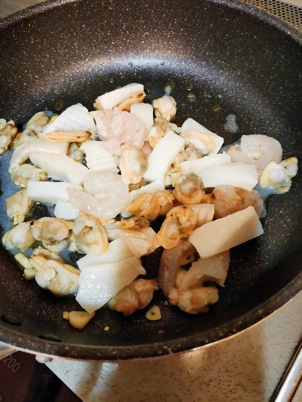 パスタソースは、オリーブオイルにニンニクのスライスを入れて弱火で香りを出して、水を切ったシーフードを炒めます。水を少し足して牛乳と生クリームを加えてしばらく火を通します。シーフードのエビが色づいたら、出汁の素と昆布茶を振り入れて、塩少々と砂糖を加えて弱火で煮ます。最後に少しずつ小麦粉を振ってとろみを調整します。