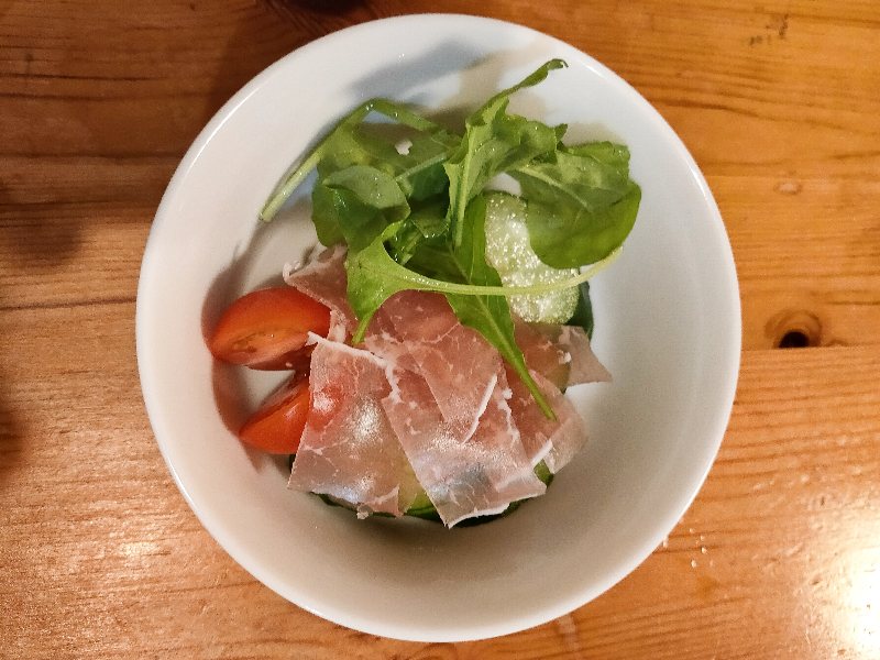 冷蔵庫に残っていた生ハムをサラダに載せて、食卓に。