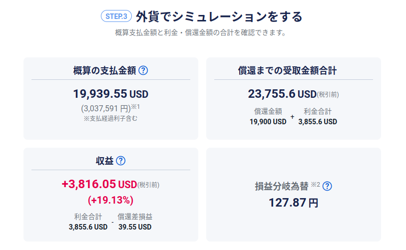 円高が128円を超えると、損が生じます。これが外貨建てのデメリット。為替相場で円に戻したときにどうなるかはわかりません。ちゃんとリスク部分のシュミレーションもしてくれます。