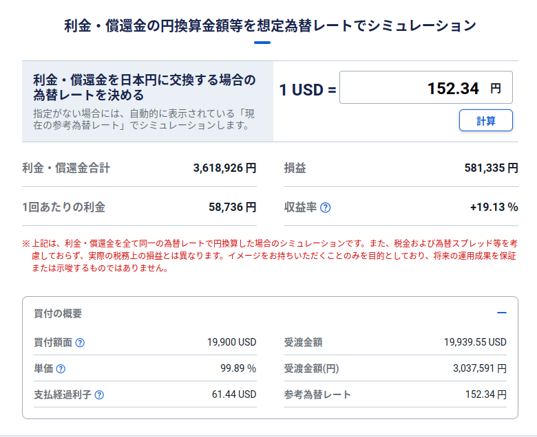 約20,000ドル購入した場合の証券会社のシュミレーションが、以下。(2024.10.25段階で)
