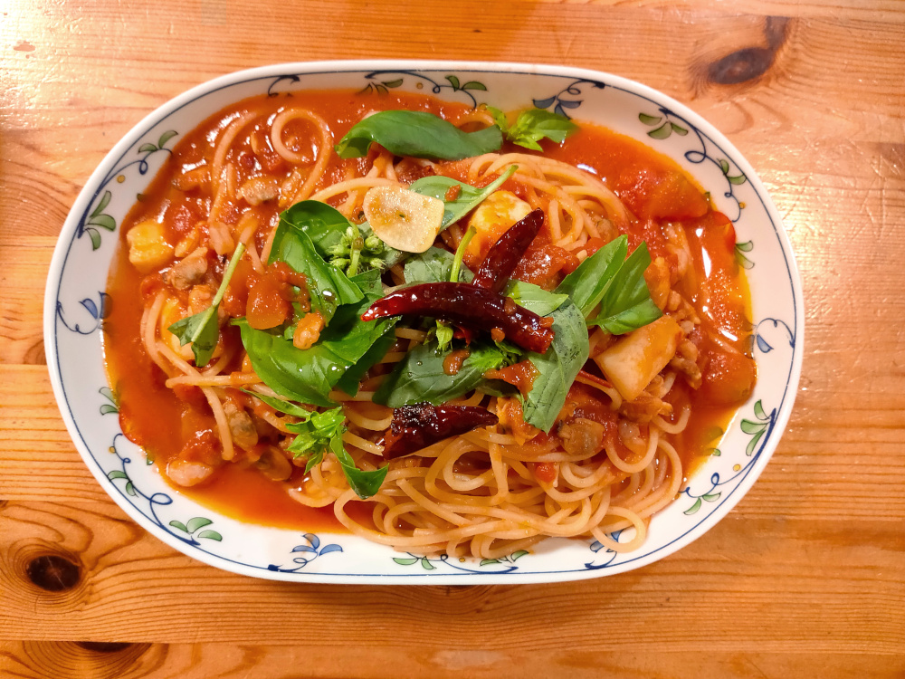こちらは、群馬名物「ベスビオ」(辛口海鮮トマトソースパスタ)