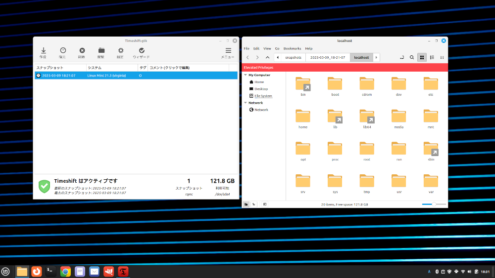 最後に、初期設定の環境をTimeshiftで保存しました。これで不具合が起きたら今日の段階に戻すことができるはずです。