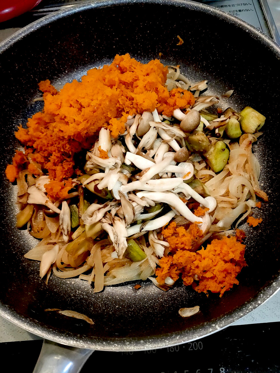 4、茄子・きのこ・擦り下ろしておいたニンジンを加えて炒めます。