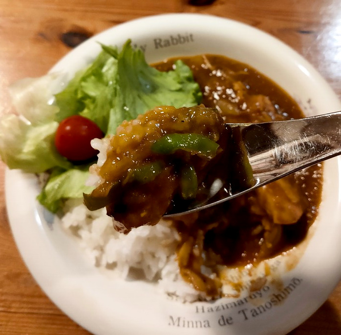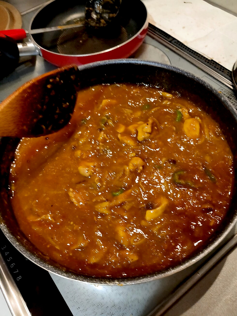 8、カレールウを加えて煮ます。ここがちゃっかりポイント!やはり市販のルウは味付けが楽です。すべてスパイスだけだと物足りない味になります。